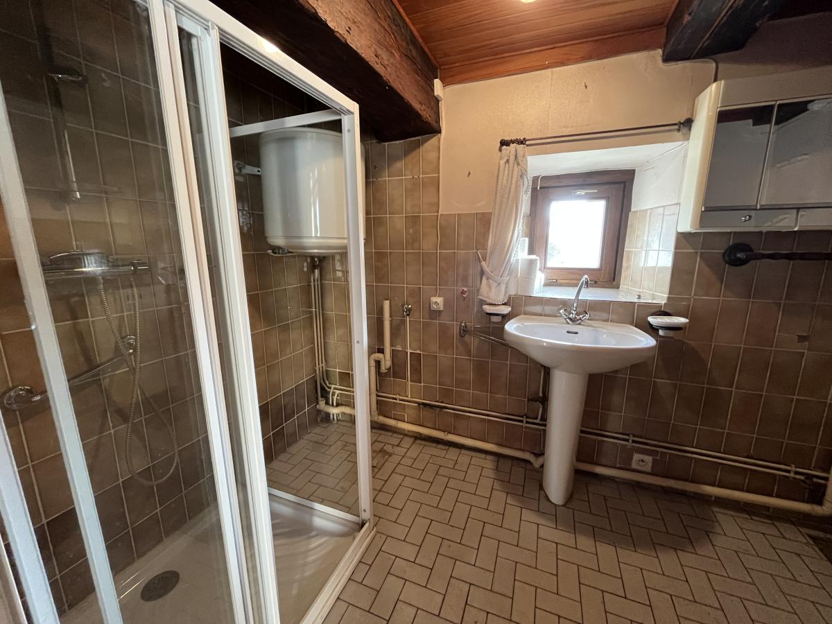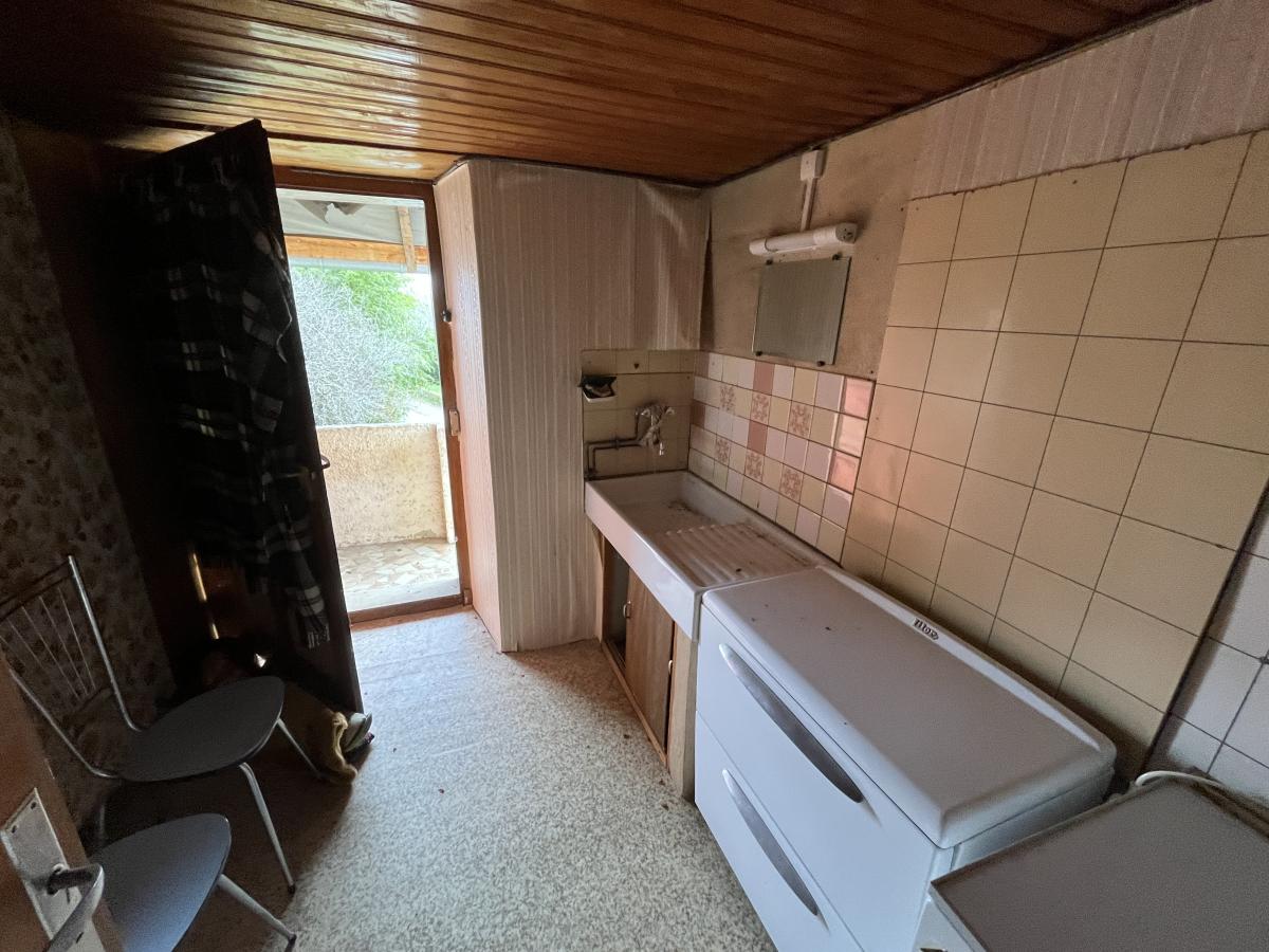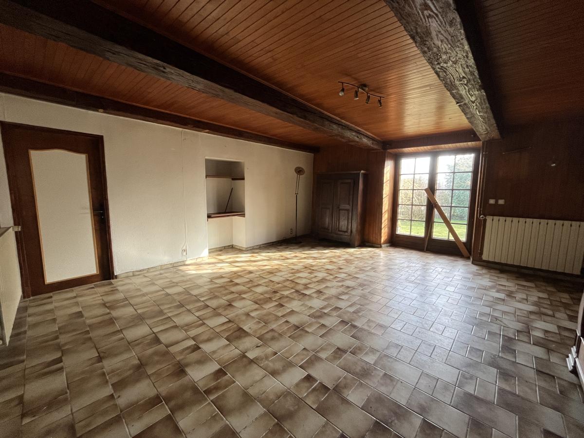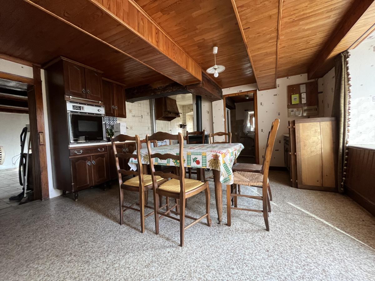 Une maison à rénover comprenant cuisine, salle d'eau avec WC, séjour salon, salle à manger, trois chambres.